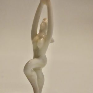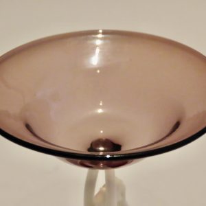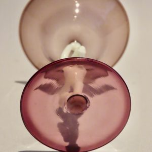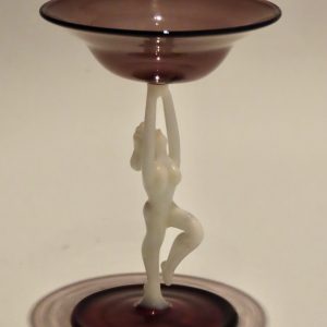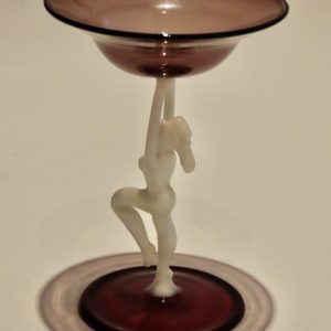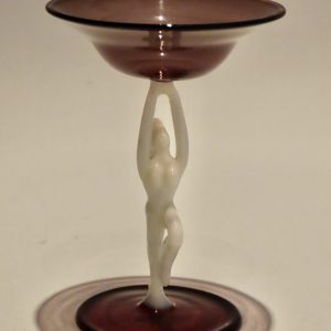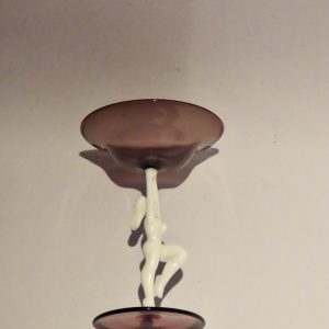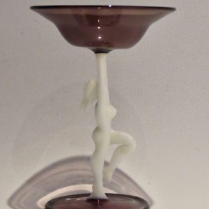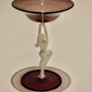 Mondgeblazen likeurglas uit de jaren’ 20 vorige eeuw waarvan de kelk en de voet van dieppaars glas zijn en de witte stam geblazen is in de vormen van een blote vrouw. Dit bijzondere Art Deco glas is ontworpen in de glasfabriek Bimini / Lauscha van Fritz Lampl. Hij was dichter en schrijver en werd geraakt door de oneindige mogelijkheden die het glasblazen bood. Eerst vanuit Wenen en later vanuit Londen zond hij zijn fragiele, geblazen ontwerpen de wereld over.