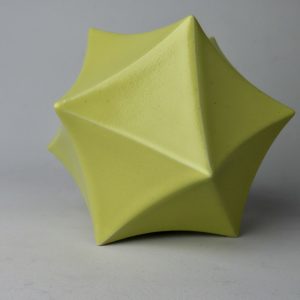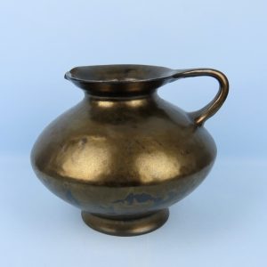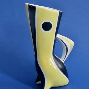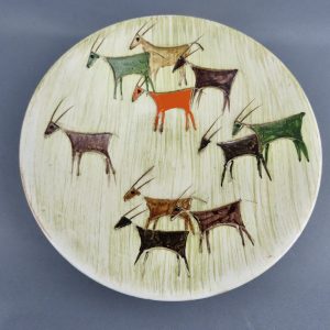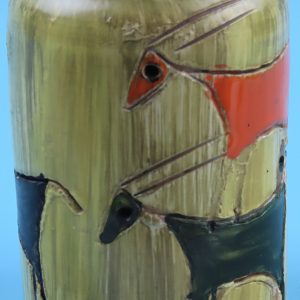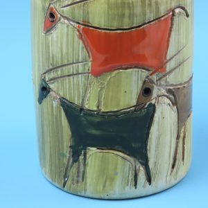 Zeldzame vaas van Bitossi ontworpen door Aldo Londi, Italië jaren ’50. Het patroon heet in het Italiaans Stambecchi of Caprone, in het Nederlands ‘De Geiten’. Londi werd geïnspireerd door de grottekeningen in Lascaux, Frankrijk. Prachtig gekleurde en geglazuurde sgraffito geiten in oranje, groen en bruin. De binnenzijdes groen geglazuurd.