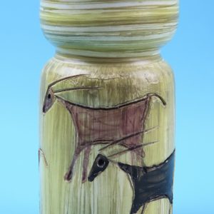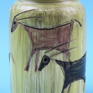 Rare vase from Bitossi by Aldo Londi, Italy, the ’50s. The pattern is Stambecchi or Caprone (goat), designed by Aldo Londi. A sgraffito and glazed pattern of goats in green, brown and orange on a brushed background with a glossy green interior. The caves of Lascaux (France) inspired many European potters.