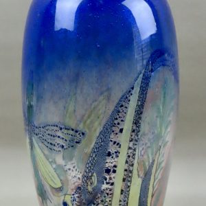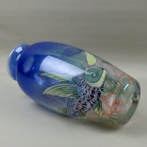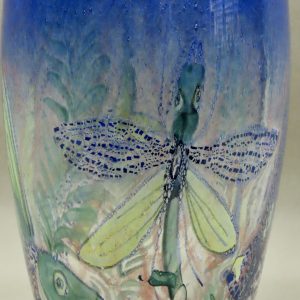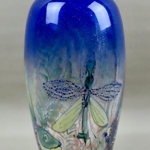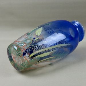 Beautiful Art Deco vase with a decor of a flying fish, dragonfly and moonfish in johnolyth glass designed by Karl John and executed by W. Hantich & Co, Haida, around 1931. This type of glass consists of two layers between which the enamelled decor is enclosed.