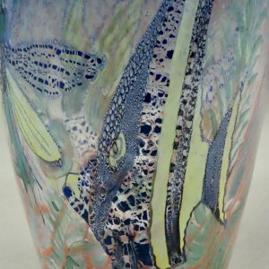 Fraaie Art Deco vaas met decor van vliegende vis, libelle en maanvis in johnolyth glas ontworpen door Karl John en uitgevoerd door W. Hantich & Co, Haida, rond 1931. Dit type glas bestaat uit twee lagen waartussen het geëmailleerde decor opgesloten zit.