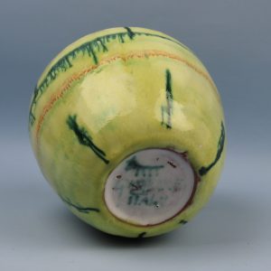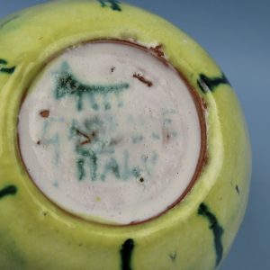 Fraai geglazuurde unica vaas van de meester van de Italiaanse keramiek Guido Gambone (1909-1969) Een zeer veelzijdig en hooggewaardeerd keramist. Tot op heden zijn er weinig stukken uit de jaren ’40 bekend met dit type glazuur. De vaas is in uitstekende conditie en duidelijk met de hand gemerkt aan de onderzijde, ook met het ‘ezel’ merkje. Zeldzaam stuk.