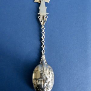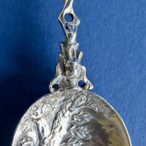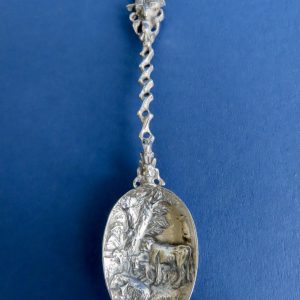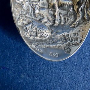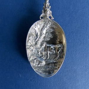 Fraai bewerkte Hollandse zilveren gelegenheidslepel uit de eerste helft van de 20ste eeuw. De lepel is uitgebreid gemerkt: Holland – 830 – BK en twee zwaardjes. Het decor is naar een schilderij van Paulus Potter.