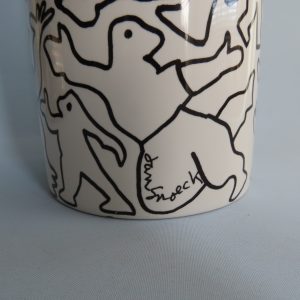 Zwartwit vaas van Jan Snoeck met de naam ‘ Des Hommes’ waarop de mens in verschillende vormen en houdingen staat afgebeeld. De vaas is in gelimiteerde oplage uitgebracht.