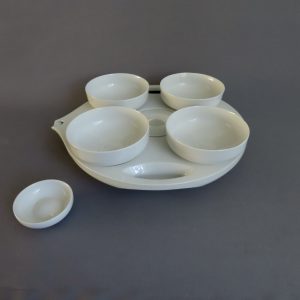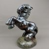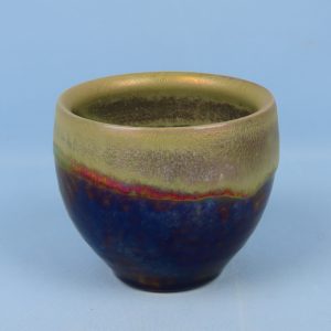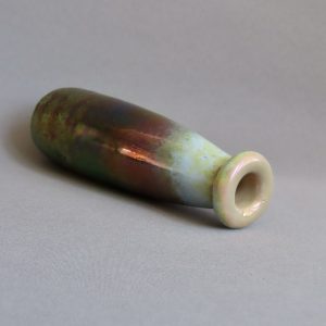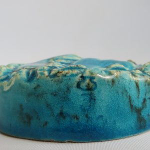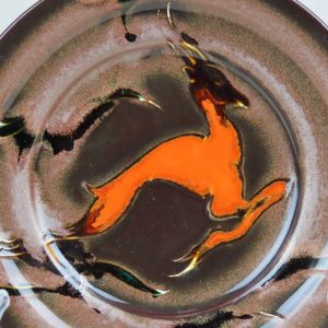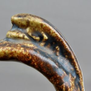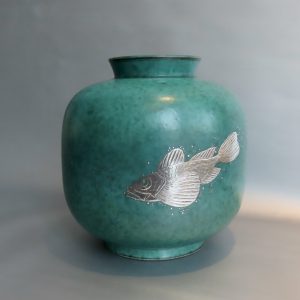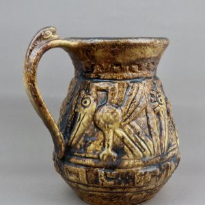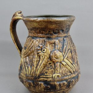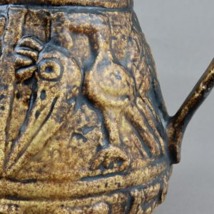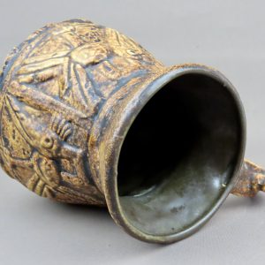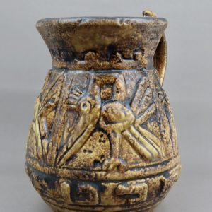 Zeldzame Jasba vaas uit de jaren ’60 uit de serie Aztec, met een knipoog naar de objecten uit de opgravingen van de Inca’s in Mexico. Decor met pelikaan, de vis zit op het handvat.