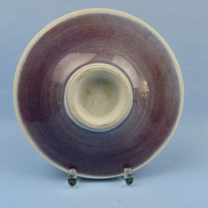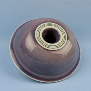 Geglazuurde porseleinen vaas op subtiele voet. De vaas heeft een geometrisch decor met ingelegde blauw-witte ringen. De vaas heeft een diameter van 14 cm en is 7 cm hoog. Duidelijk monogram in de voet. Fraai paars hoogglans glazuur.