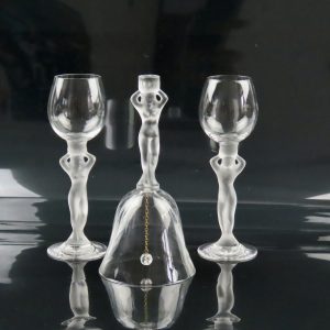 Voor de lamp geblazen, handgevormd, uiterst verfijnd cocktailglas met een dansende blote dame die de cuppa boven haar hoofd houdt. Dit glas is gemaakt in de glasstad Lauscha, Midden-Duitsland, aan het begin van de vorige eeuw.