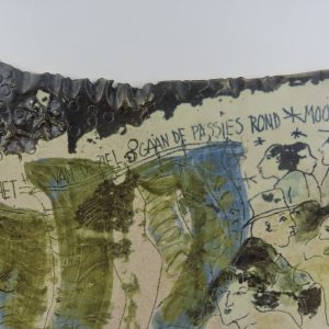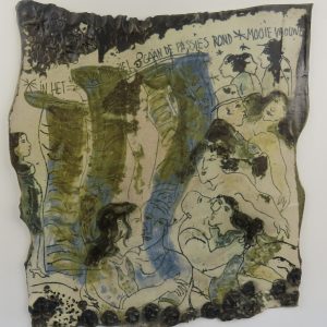 Lies Cosijn (1931-2016) Dutch ceramist. Unique ceramic piece on Trespa panel. Signed. With text: “In the heart of the soul, passions revolve around beautiful women”.