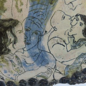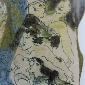 Unica keramiek op trespa plaat. Gesigneerd. Met tekst: “In het hol van de ziel gaan de passies rond mooie vrouwen”.