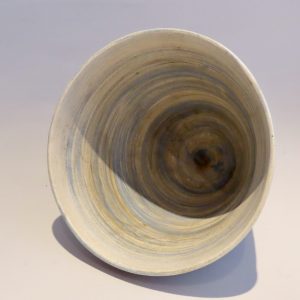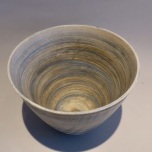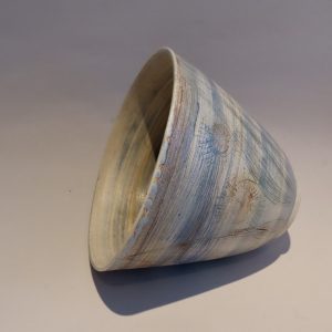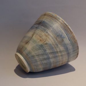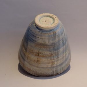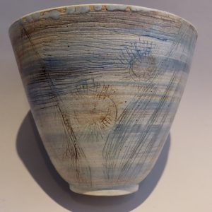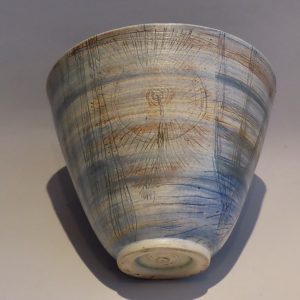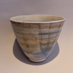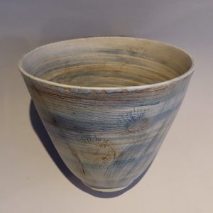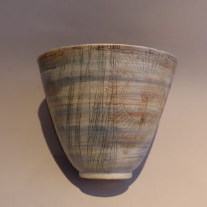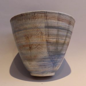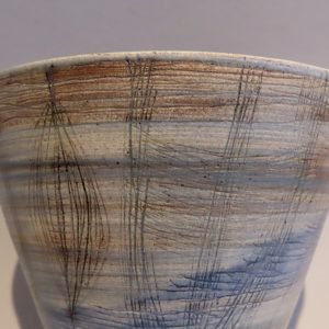 Ceramic vase, widening mouth on small foot with engraved decoration in soft pastel shades. Marked and dated ’74. Excellent condition – 10 cm x 12 cm.