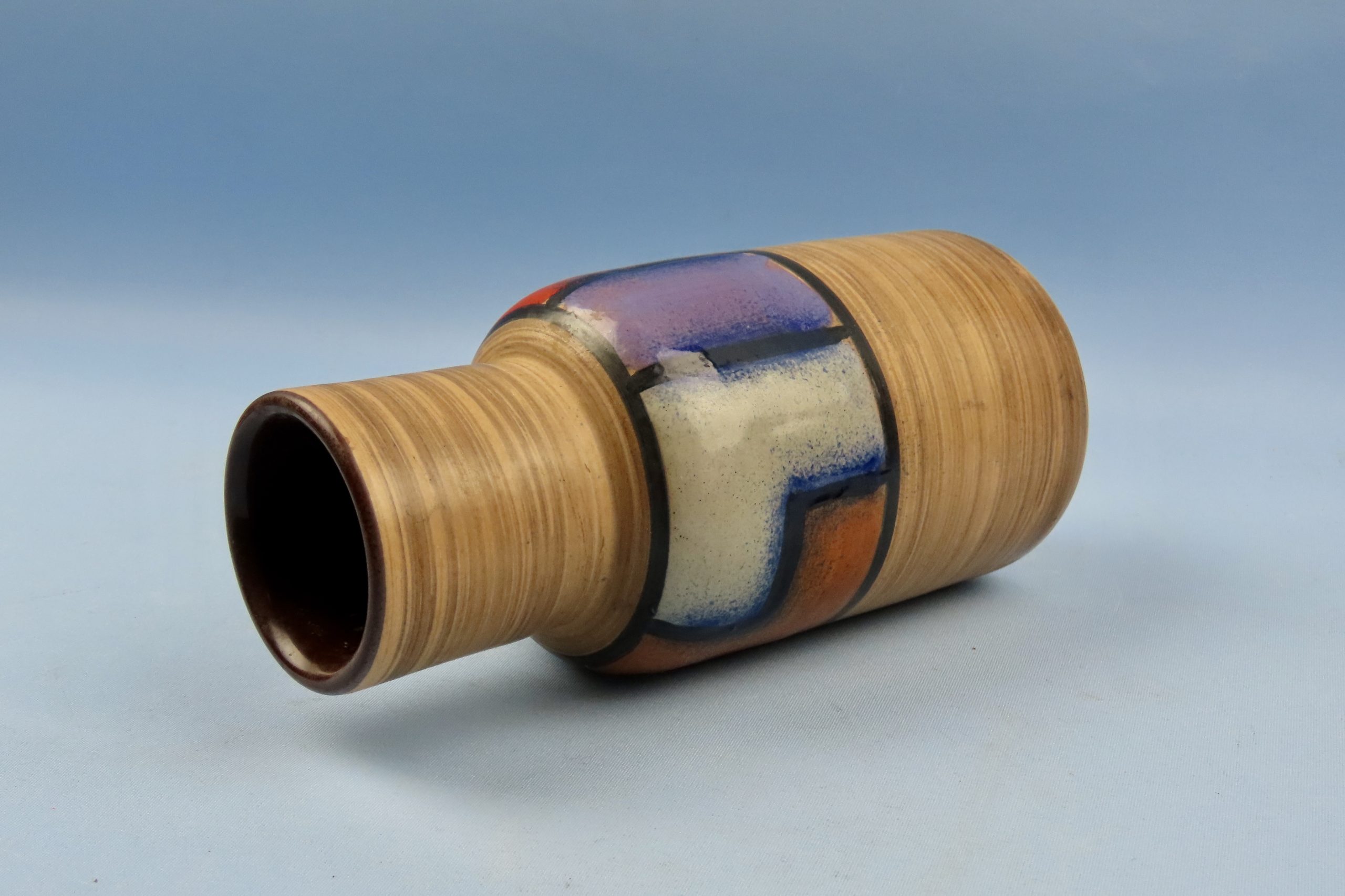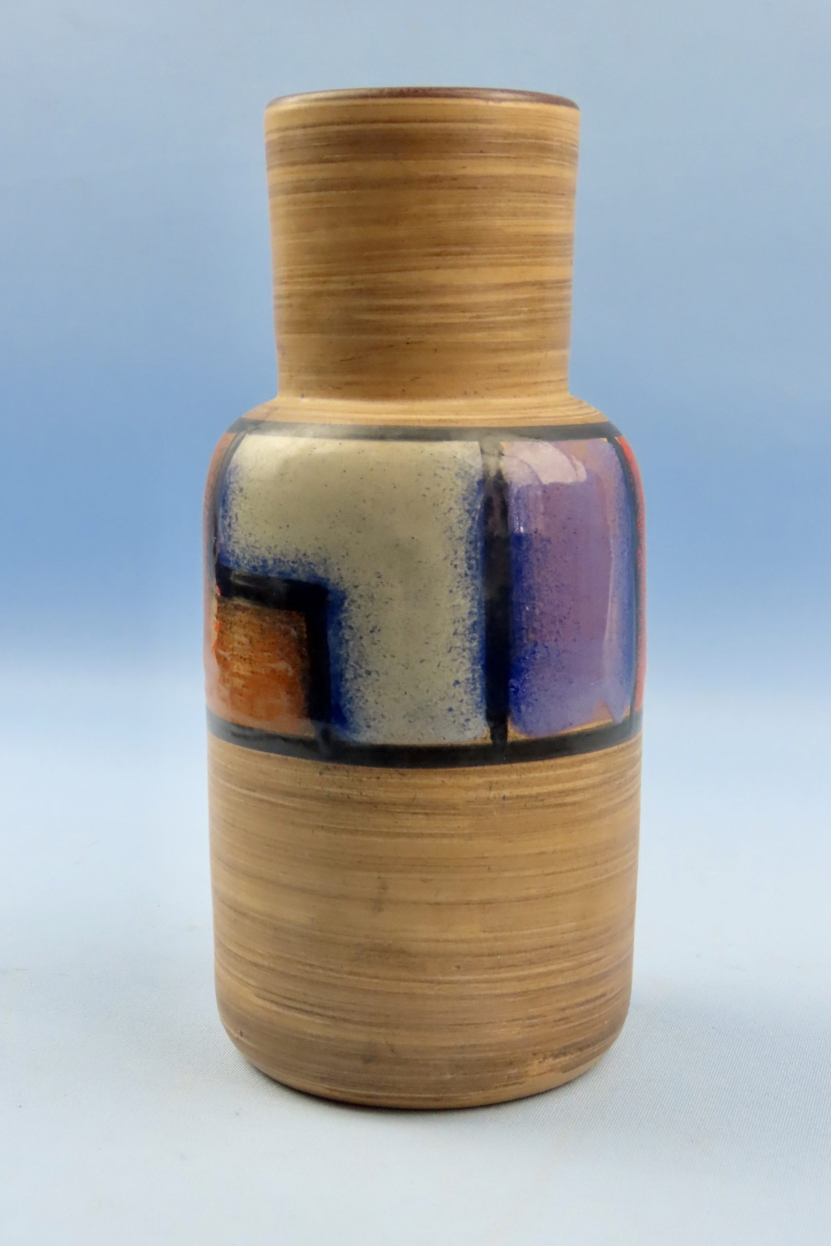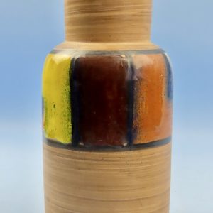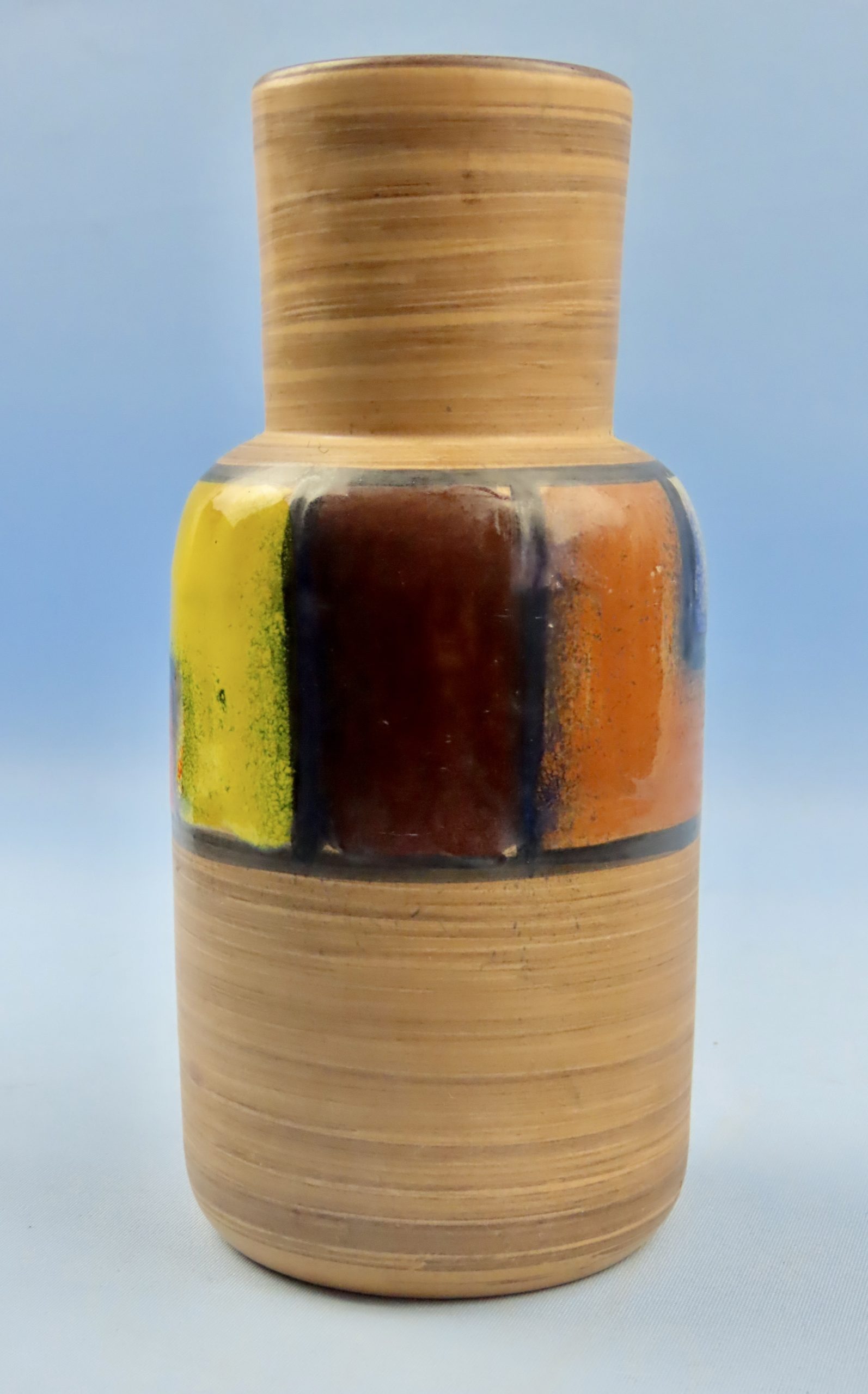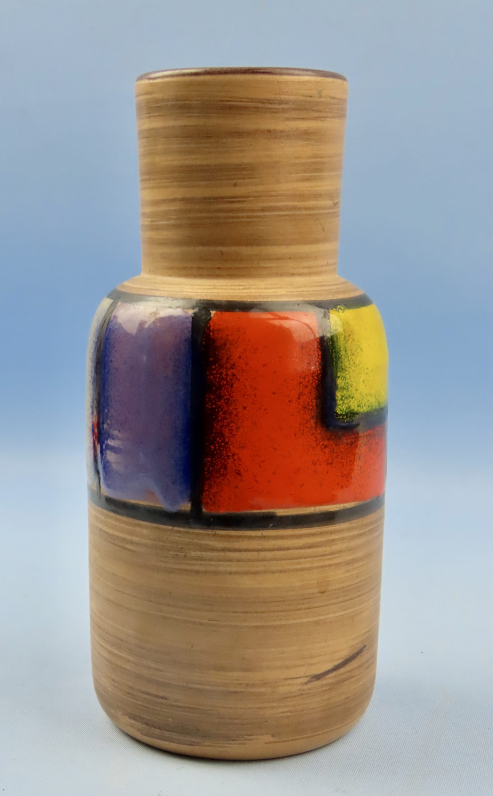 Fraaie en gave mid-century Bitossi vaas door Aldo Londi. De zogeheten Vetrata vaas bestaat uit geglazuurde vlakken in geel, oranje, bruin, oker, blauw, paars en grijs op een geborstelde ondergrond.