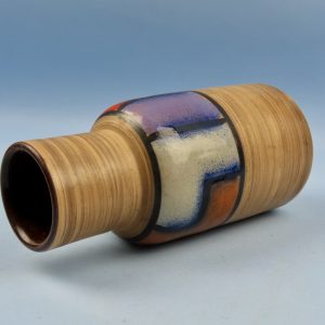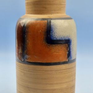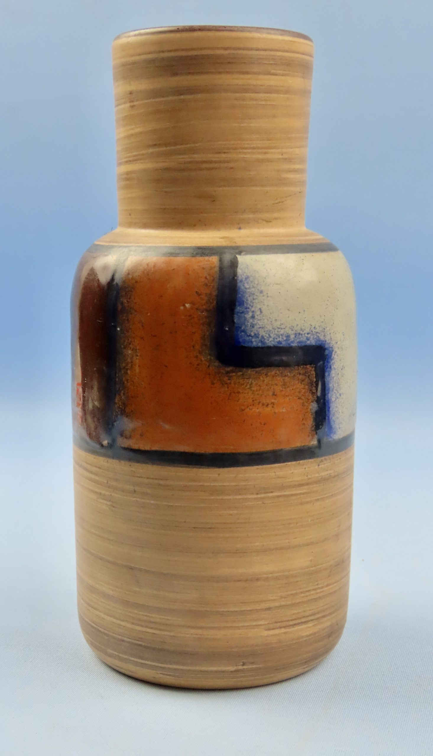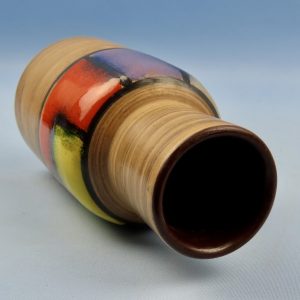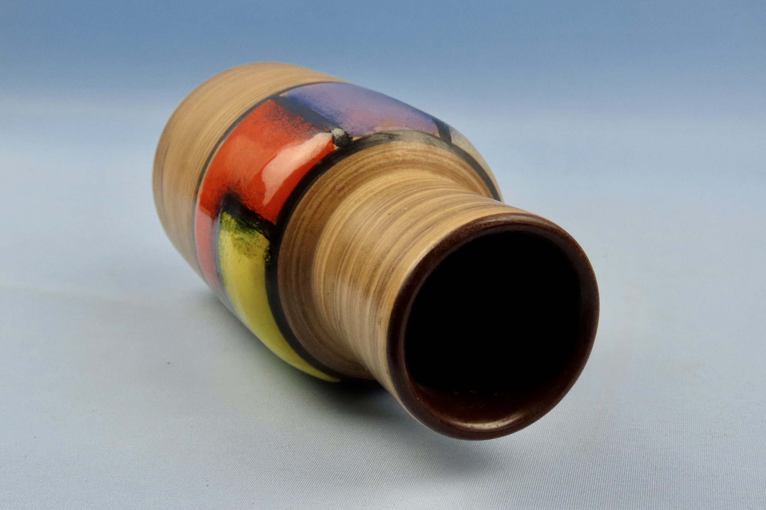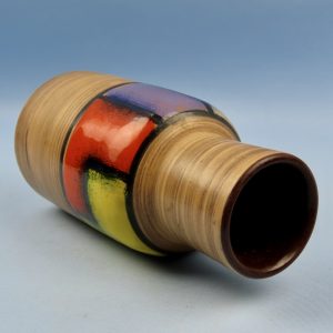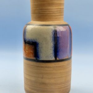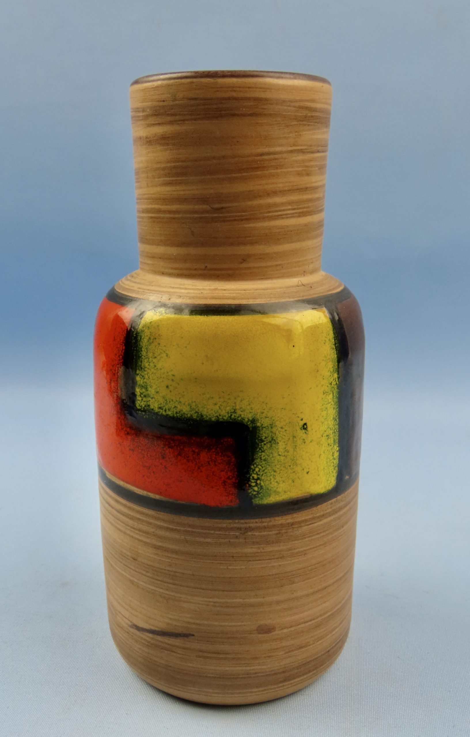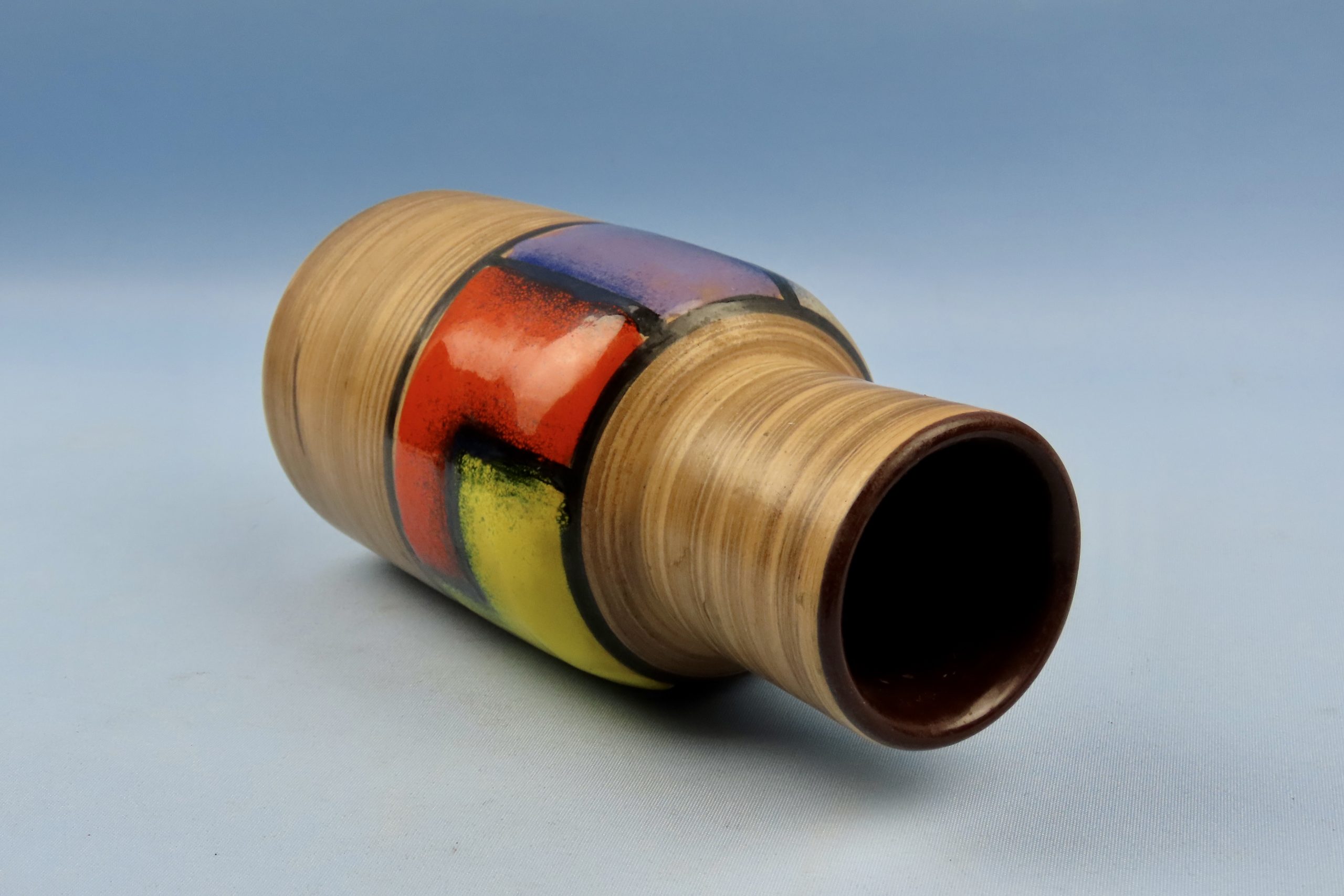 Fraaie en gave mid-century Bitossi vaas door Aldo Londi. De zogeheten Vetrata vaas bestaat uit geglazuurde vlakken in geel, oranje, bruin, oker, blauw, paars en grijs op een geborstelde ondergrond.