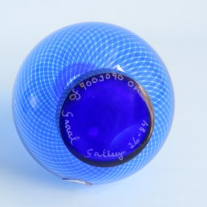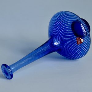 Olle Alberius(1926-1993) was een beroemd glas- en keramiek ontwerper die werkte met traditionele glasblaas technieken. Deze twee mondgeblazen vazen in filigraan – een techniek waarbij witte en gekleurde glasdraden verwerkt werden – zijn een verfijnd ontwerp.