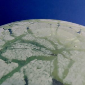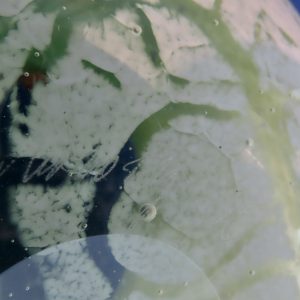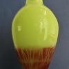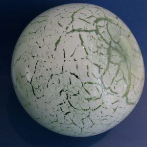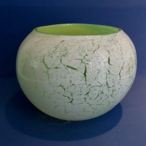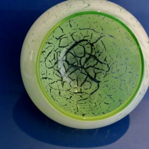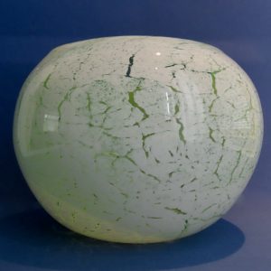 Bolvormige vaas met wijde mondopening in groentinten waarbij het gelaagde glas bewerkt is met een craquelé techniek. De vaas is ontworpen en uitgevoerd door Ondra Novotny in 2005.