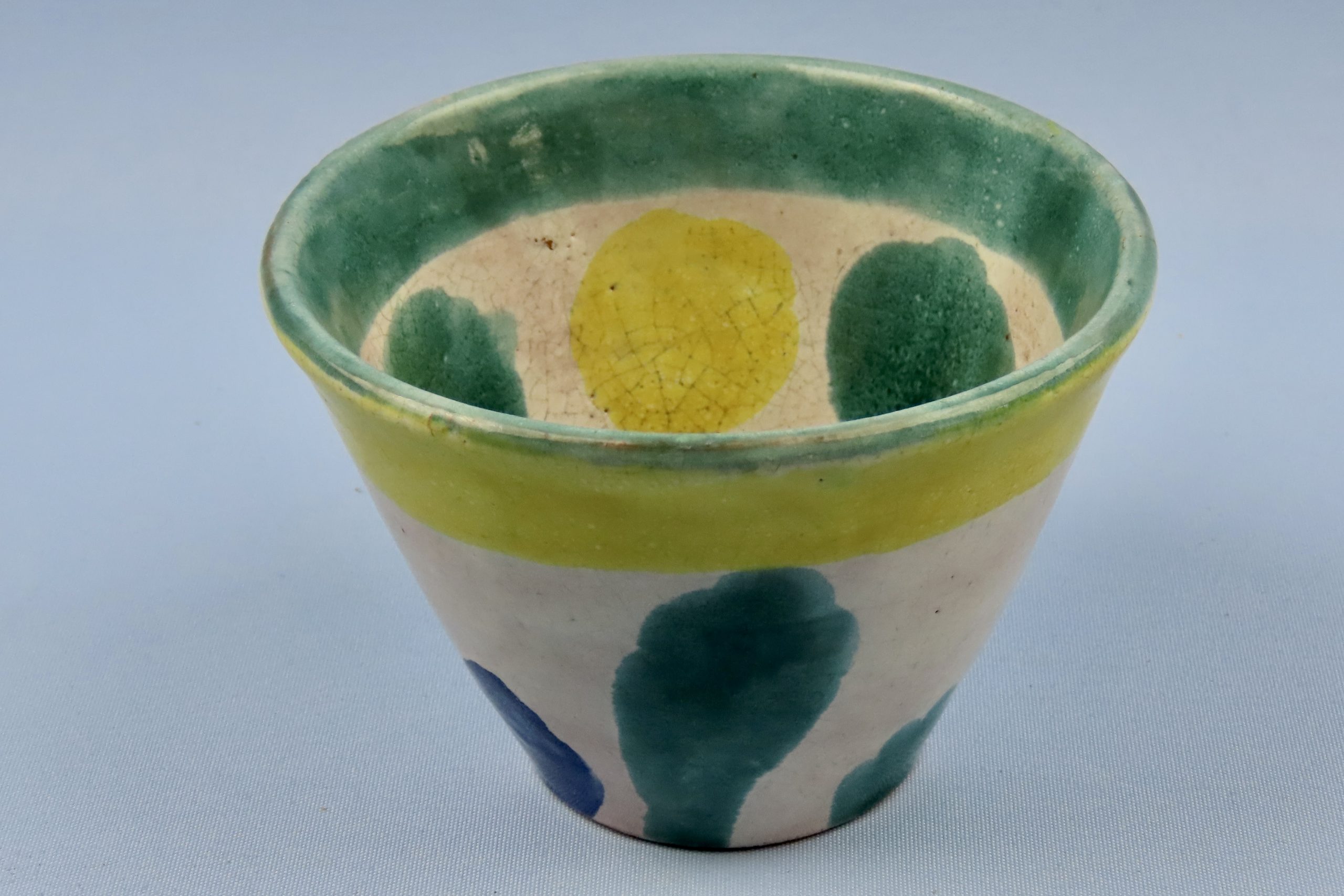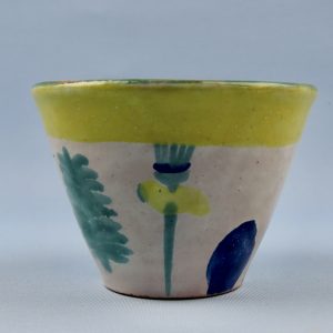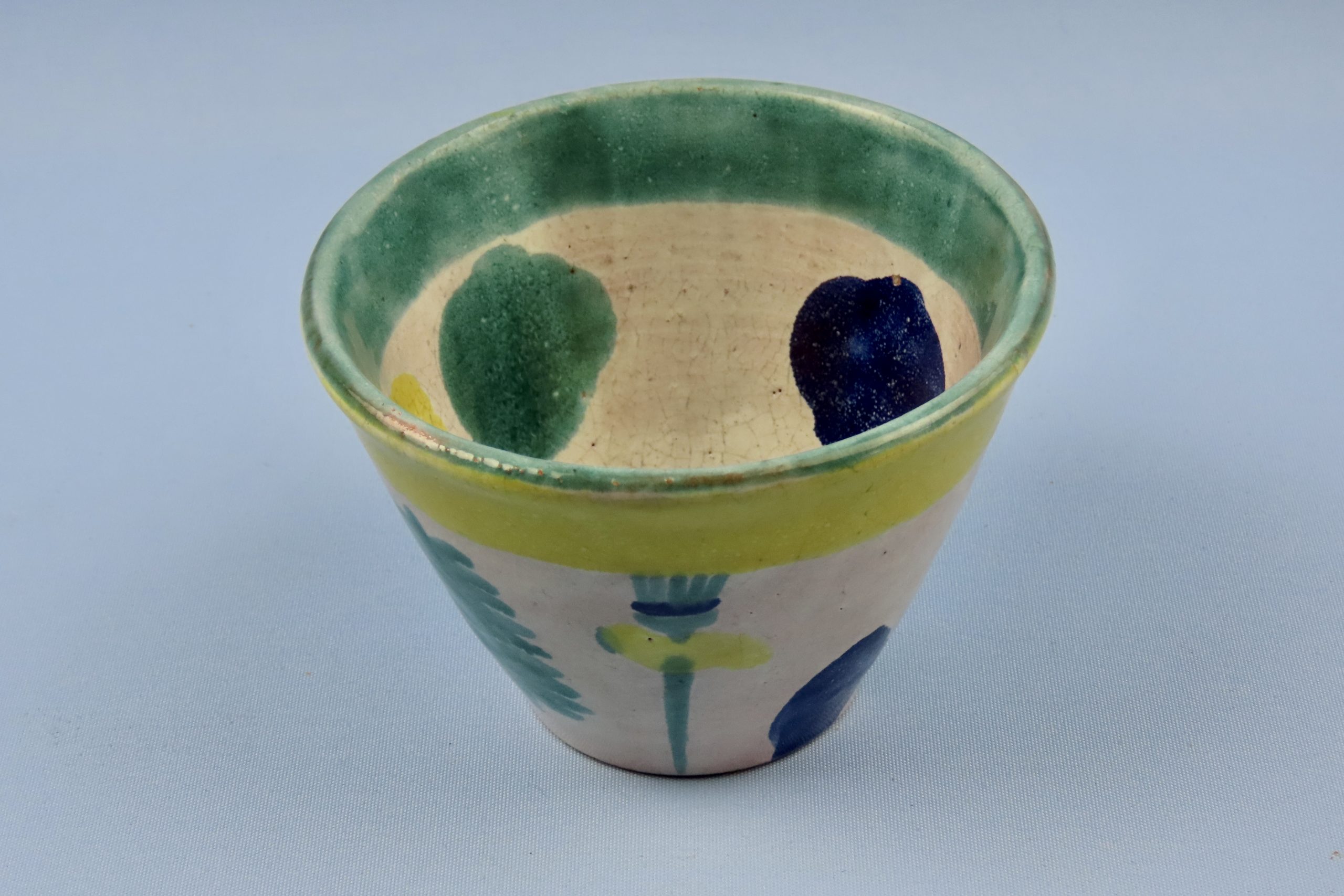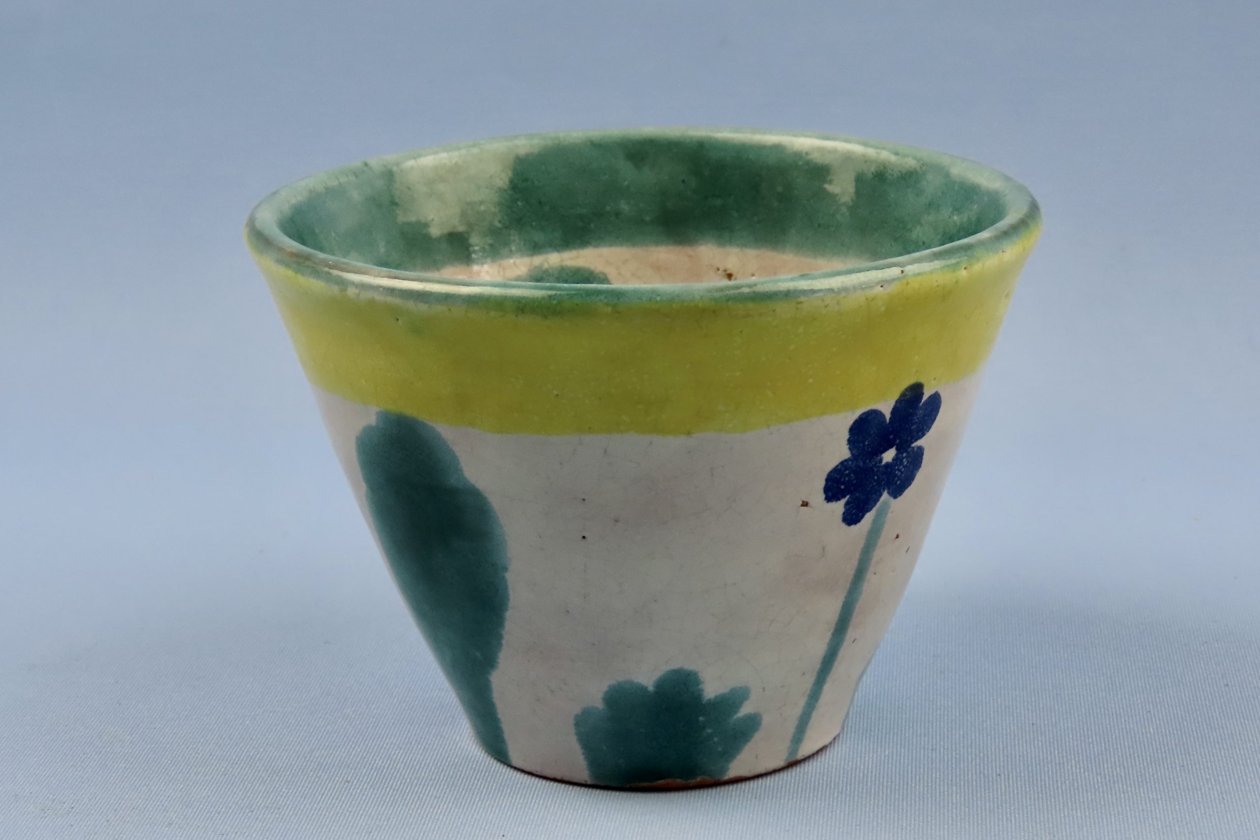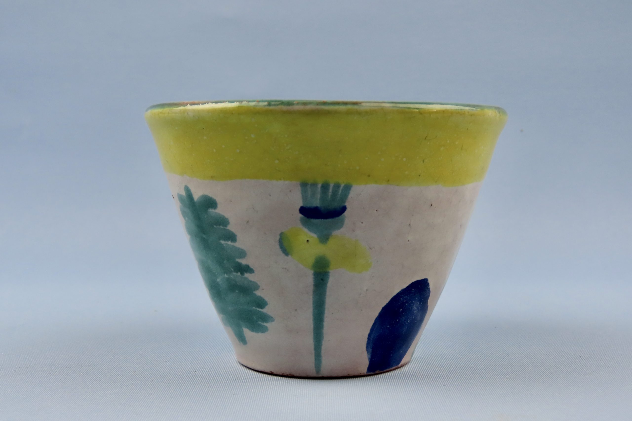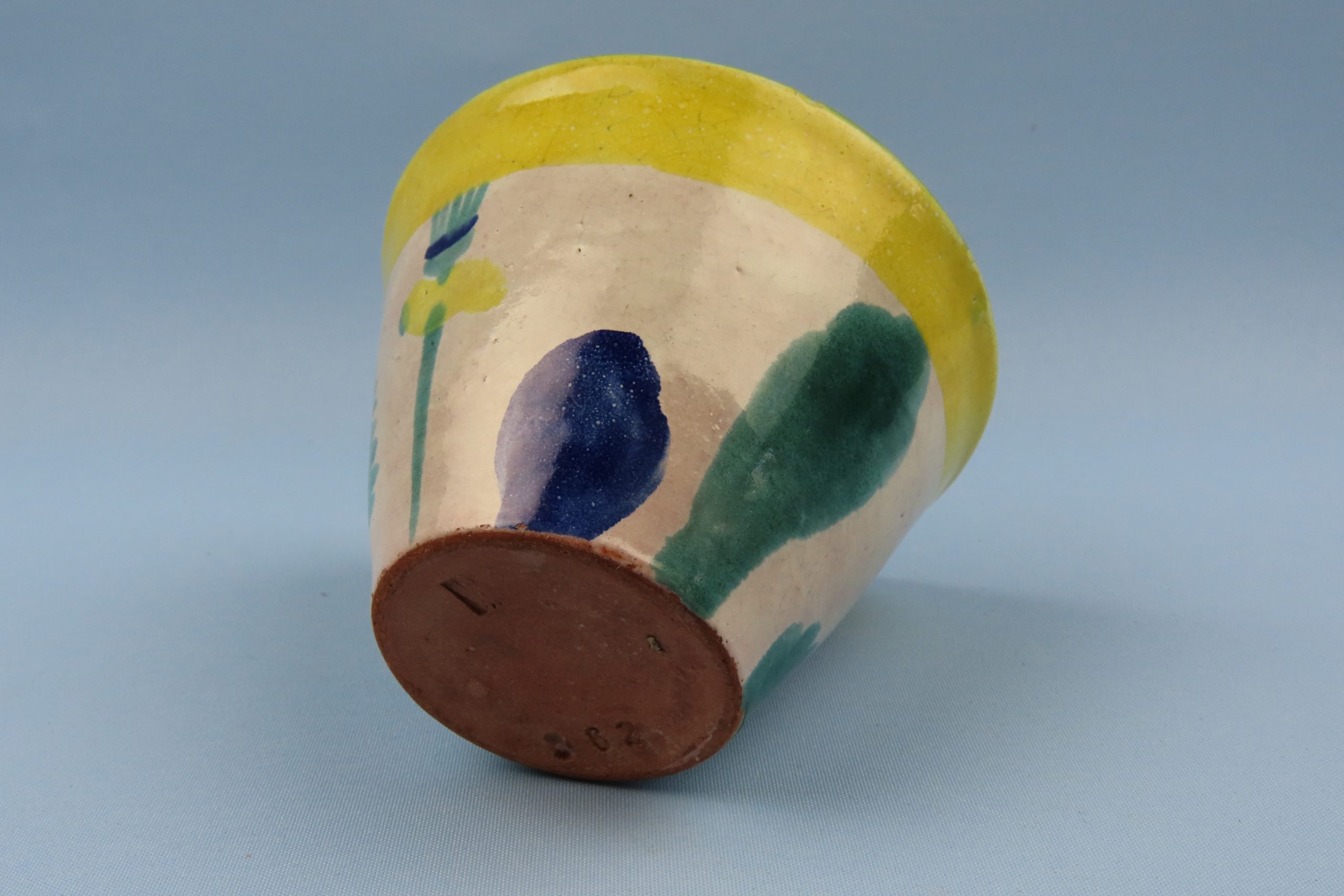 Fraai en zeer zeldzaam plantenpotje van geglazuurd aardewerk met een naïef decor van bloemen. Het potje is in gave staat en gemerkt met het WW-stempel van de Wiener Werkstätte en het nummer 862.